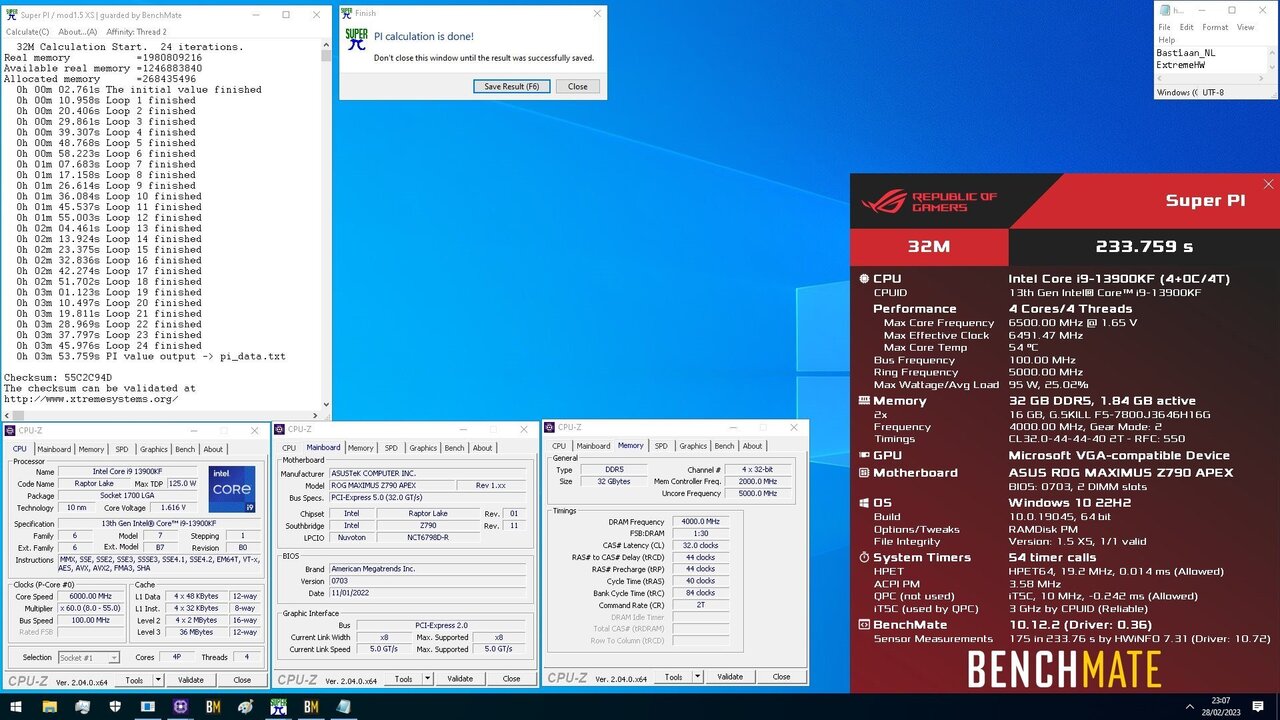 /img/logo.png Bastiaan_NL`s SuperPi - 32M score: 3min 53sec 759ms with a Core i9 13900KF (8P) HWBOT.ORG The Core i9 13900KF (8P) @ 6500MHzscores getScoreFormatted in the SuperPi - 32M benchmark. Bastiaan_NLranks #73 worldwide and #10 in the hardware class. Find out more at HWBOT. A busy evening of testing for the G.Skill competition, not that I stand a chance against the top guys but I like to do my best Still a lot of tuning/headroom but I decided to run a few benchmarks with the current settings to see how they compare later down the road.