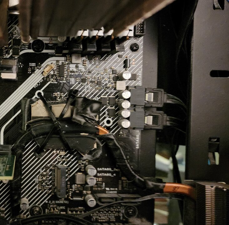 4. IRL I'm... well let's leave it as I've got a resume that's fitting of a supervillain and normally there isn't a OTS solution for the problems I solve. Where angels fear to tread is just my warmup. The heatpipe cools a chip of about 25-35W, the chip set is like 15W. Heat pipes are amazing pieces of tech. So the end result is that I was more of using the laptop heatpipes because I don't have access to heatpipes that are bent in the shape needed. The CPU based SATA ports on the board block the easier to fit heatpipes and I use those for my RAID0 array. The basic rule to it is you have to avoid bending the heatpipe enough that you cause it to get a pinhole and leak, but they are somewhat forgiving of abuse. The heatpipe does not show it but it's kind of bent up. If I do it again, I'm going to see if I can attach a heatpipe onto the chipset heatpipe to cool the NVMe SSD. I hate the idea of adding moving parts to a machine by using a CLC, so I Have to get creative on how to route heatpipes to cool stuff where most pople would throw in the towel and just CLC the thing.