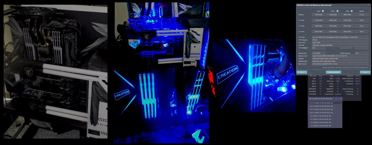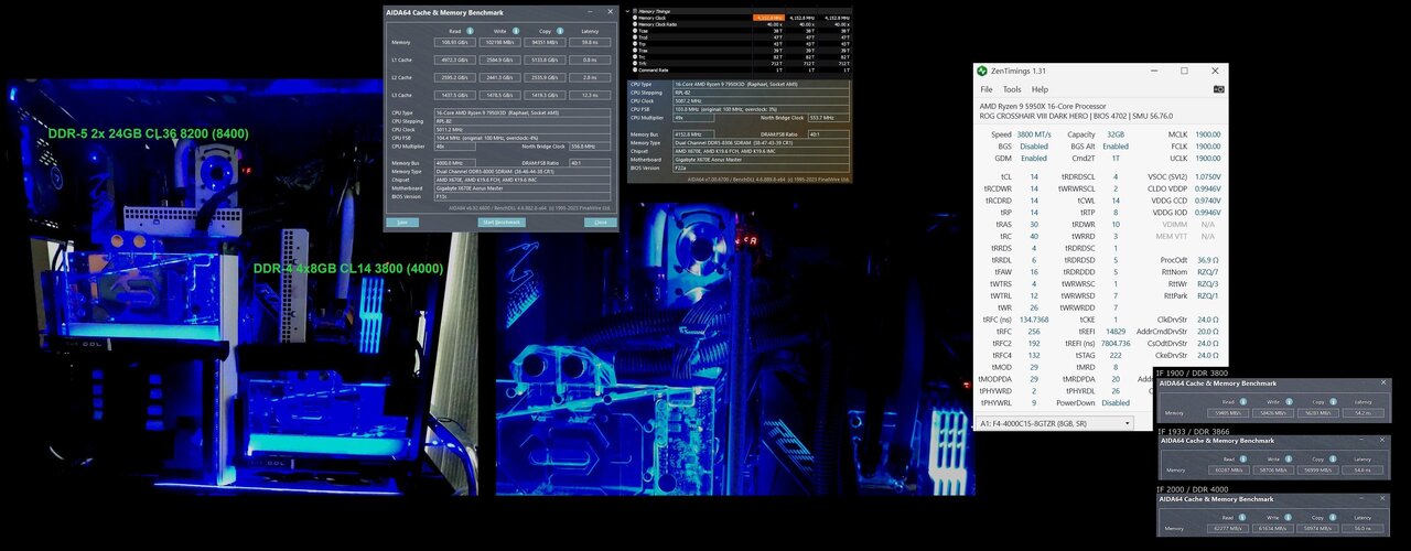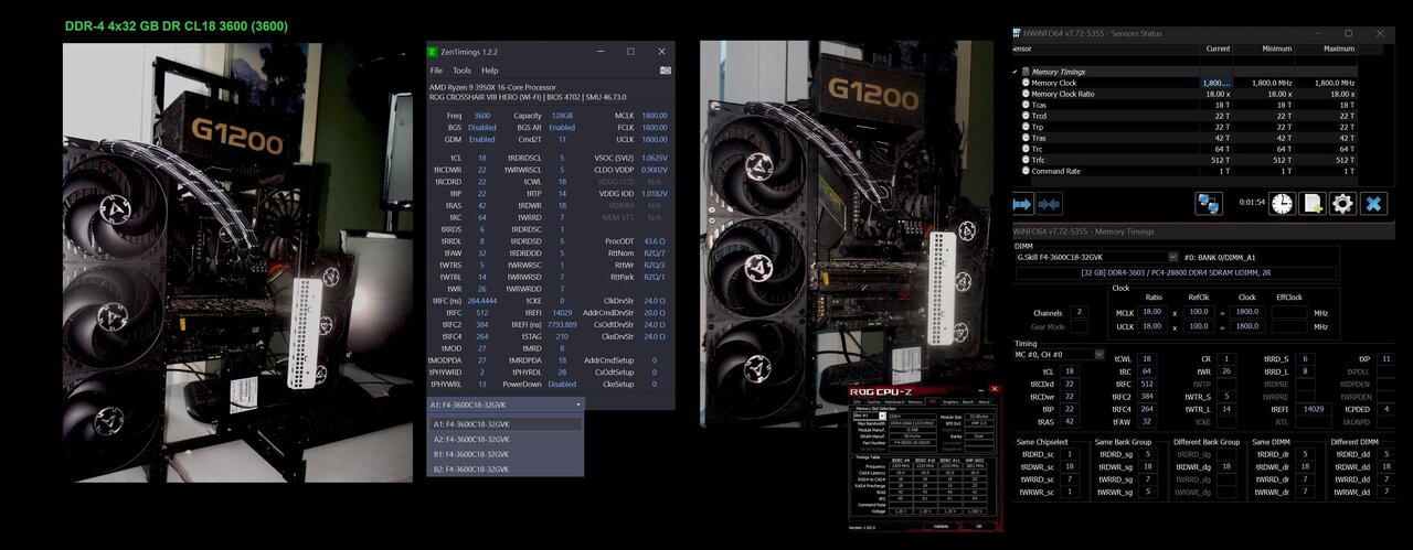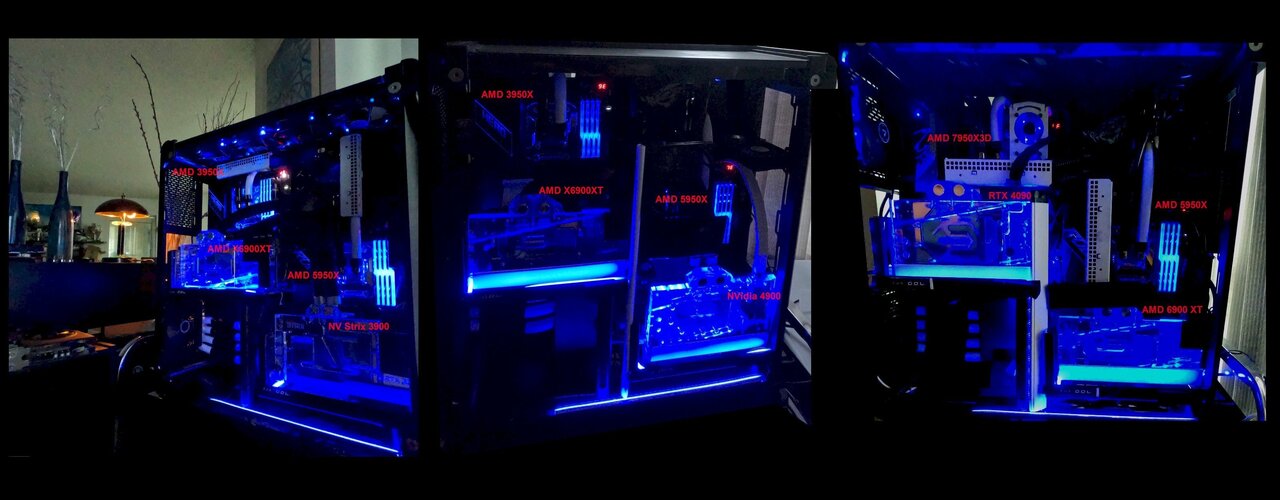 ...Being in the computer business software development field, there are periodic surges of updates re. home-office equipment whereby one upgrade leads to another, and another, and another...sort of like dominoes falling. Below is a quick pictorial of the latest changes which led to a RAM_up across the boards (pardon the pun)...whereby I am not talking about our commercial rack servers (and the racket they make...) but far-faster, yet less-stressed, ex-gamers pressed into productivity dev service after their time in the OC gaming sun is over... Back in late January '21, a then-new Asus CH8 Hero Wifi joined the line-up along with 32 GB (4x8) of 3866 Samsung-B and an Asus Strix 3090 OC along with related custom water-cooling equipment. Its domino affected my prior TR2950X, 2x 2080 Ti setup. A few months later, a 5950X / CH8 Dark Hero / Radeon 6900XT joint the fray, per pic below for a dual-mobo single-case project...then the 4090 arrived along with its w-block...replacing the 3090 which left only to re-appear in another pic sequence below... In October '23, another re-shuffle in the dual-mobo build happened, now featuring an Aorus 670E Master, a 7950X3D and the 4090. In early March '24, the original 2x 24 GB DDR5 running at 8000 was replaced by a 2x 24 GB 8400 set running at 8200 (and beyond 8400...). 96 GB is only a question of time now...the 5950X and the migrated 6900XT are now the daily beast of burden for non-dev work... In the meantime, the prior gamer-now-home-office 2950X backbone added the Strix 3090 OC to its dual 2080 Tis, and also got 32 GB back which earlier seeded the 3950X - so back to full strength with quad-channel DDR4 64 GB, and its 8x8 sticks of Samsung-B with matching tPHYRDL...it still is a great platform for ML-type work, now with 3x NVidia GPUs and their combined tensor cores... Finally and most recently, the '21 gamer - a.k.a. the 3950X - got promoted to premier development web / SQL server, now sporting 128 GB of new DDR4 3600 CL18...of course I confirmed that oc_CL16 would also work but this being a pure development & SQL server now, I only tightened rRFC a bit before running extensive AVX2 and other RAM stability tests. 6TB of fast storage round out that update project ...very pleasantly surprised how easily the 3950X AM4 platform accepted 128 GB 3600 XMP w/o a fuss or a single WHEA. On top of that, also yields matched tPHYRDL across four sticks... ...more dominoes will fall - 128 GB R-DDR5 7200 is just a question of time now for the home office...