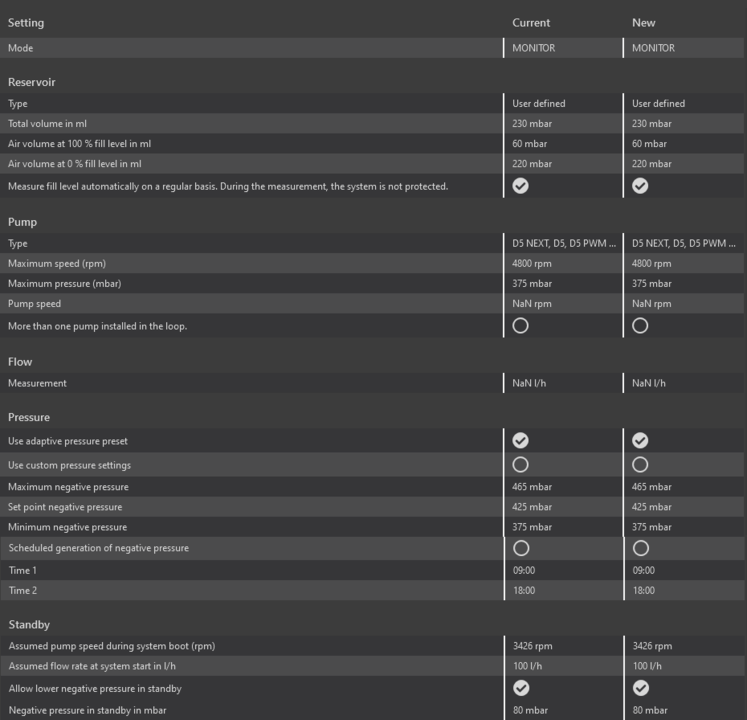 So after a long wait the Aquacompter Leak Shield arrived yesterday! Having a few issues with it which is causing a few headaches. One is the fill level is reading it at 44% when it clearly not. I'm assuming fill level is in fact the water level. It's worth noting that the picture was taking while there was no vacuum as the water level rises when the vacuum is engage. I'm also having a issues when the PC is tuned off. Everything is turn off including the pump the only thing which stays on is the leak shield. I get that the pump adds pressure, but when the system is turn off and alarm is triggered detecting a leak due to a pressure drop. I also have a small air leak going into the loop at high mbar. Which is under understandable when a system has negative pressure. As far as I know air leaks happen in all systems and is worth to strip my PC down to re tighten everything. Before installing the leak shield I checked for leaks (water and air) and to my knowledge there wasn't any. Any advice would be grateful. EDIT: Manage to fix the warning messages when Leak Shield is in standby mode by reducing the pump output from 3430 RMP to 2079RMP. The Pump adds positive to pressure, when the pump is turn off that positive pressure drops resulting in the negative to rise. Causing a "false leak" .