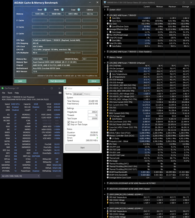 Upgraded from 9900K @ 5.15GHz 0AVX 1.304v. The smoothness in FPS games is unreal. 7800X3D (SP96) DR5=6400 FCLK=2200 ECLK=102 MULT=50.5X BOOST=5151MHz Found something even more failure-prone than AIDA64 SHA3 -- CPUZ (v2.06) AVX2 (v19.01.64) and AVX512 (v19.01.64). CO -25 was passing 20x+ SHA3 runs, LinPackExtreme, y-cruncher. Run CPU-Z AVX2 or AVX512 benchmark = insta reboot. Retuned each core with Process Lasso and arrived at: -20*/-20/-15/-20/-20/-20/-15/-20 Performance Test 10.2 brutality on an Alpha Core1 waterblock and SuperNova radiator:
