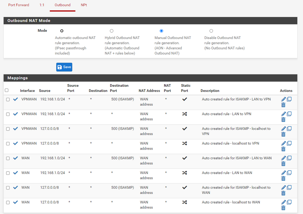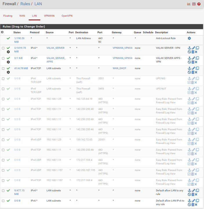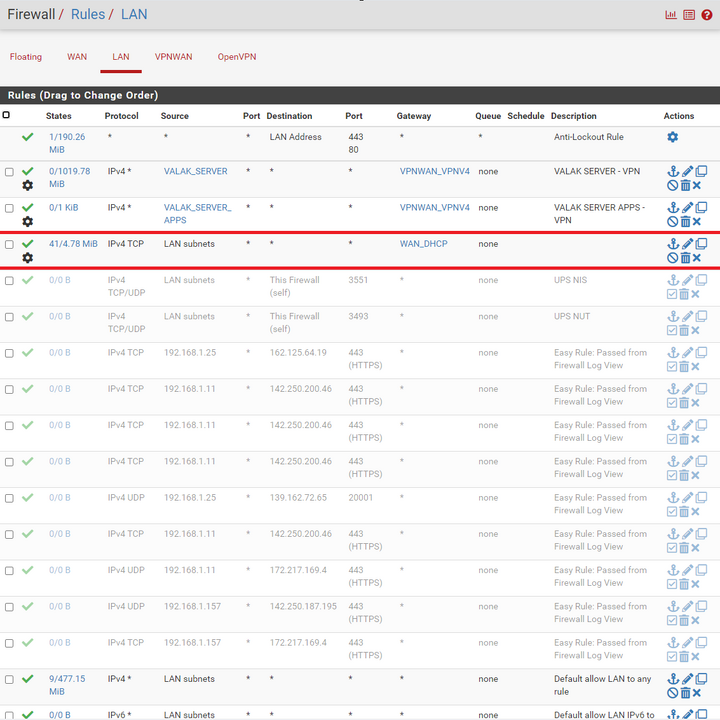 Hey guys, I need some assistance from anyone who has configured a VPN on their PfSense firewall. To cut a long story short, I moved to a new ISP that deploys CGNAT. This makes port forwarding virtually impossible which affects my ability to broadcast Plex outside of my network. I have since signed up with PureVPN that offers a dedicated IP with Port forwarding. I have everything setup on PfSense and the VPN is connected, so that is all good. The issue I am having is that I want to configure firewall rules on PfSense to direct only my Plex server over the VPN WAN, but the rest of my networked devices over the standard WAN. I have followed various guides and I am 99% of the way there but with my current configuration, either all of my network ends up over the VPN, or none at all. Here is the current configs with respect to LAN Rules and Outbound Rules, I am fairly sure I have the rules in the correct order as well. LAN Rules As the above screenshot I have set a LAN rule for my device "Valak Server Apps" & "Valak Server" which is set to use the VPNWAN Gateway as these are the only devices on my LAN that should be using the VPN. The 3rd rule down as highlighted is the rule that is supposed to dictate that all other devices on my LAN subnet should go over standard WAN. The rules are put in the correct order on the list as the VPN rules for "Valak Server Apps" & "Valak Server" should take first precedence over the 3rd rule down as highlighted. Outbound Rules The outbound rules on the "VPNWAN" interface are duplicates of the "WAN" interface rules, other than the VPNWAN rules point to the VPN Gateway. These look to be set correctly and in the correct order, after checking a few different guides on the matter. .......................................................................................................................................... So far as I'm concerned the current configuration on LAN. My Plex server should go out over the VPNWAN, while anything else should go over the WAN and that is the order I have set the rules in. HOWEVER, note the rule I have highlighted on LAN screenshot. If I disable that rule, everything goes over the VPNWAN, if I enable it, everything goes over the WAN. I was expecting that rule to send all other traffic over WAN while Plex used the VPN WAN, but it is not behaving that way. Not sure what I am missing but hopefully someone can help. Thanks, E