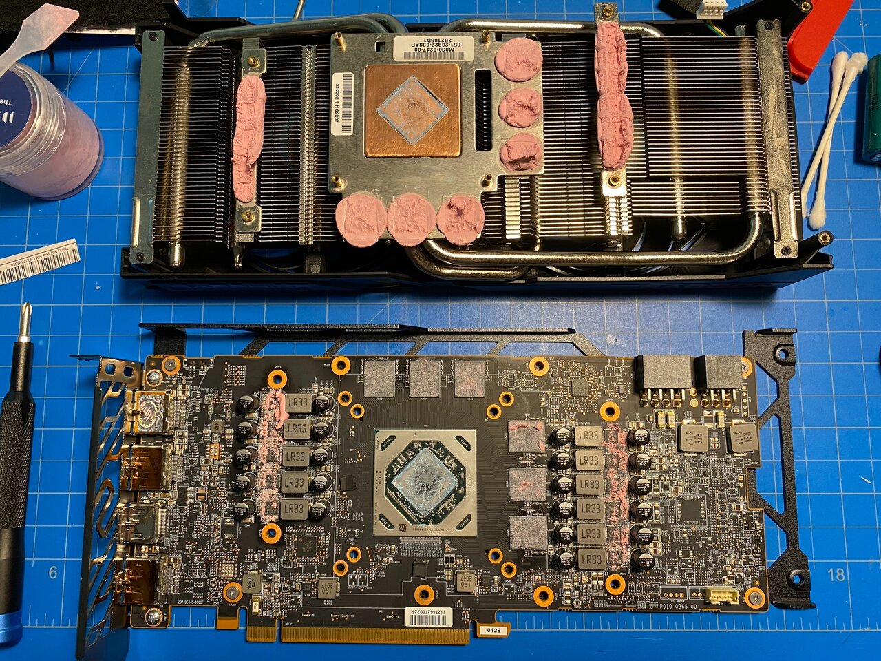 8. I'm also a big fan of thermal putty as a pad replacement. It removes all the guesswork and allows for the best possible contact and pressure on the core. A very common issue that people run into when upgrading to high performance pads, is that they are more stiff / harder to compress than OEM. Even if you get the proper thickness, they can prevent optimal core contact. Good putty matches or outperforms high end pads, so there's really no downsides AFAIC. Sure it leaves a bit of residue, but high end pads do as well. IME, it's easier to remove and clean after it has been on a card for a while, because it will stiffen up a bit and come off in complete pieces. Depending on the age, you may be able to reuse it too. You can knead and mix it back together to soften and even out the consistency. Not too long ago, the only decent choice was TG-PP10, but it has since been discontinued. Fortunately there are quite a few options on Aliexpress that outperform PP10 now. Snarks Domain on YT has done some nice testing of different putties. Based on his results, I snagged some U6 Pro and it has been great. More gooey than TG-PP10, which I'm not super fond of, but once it bakes for a while, it becomes more cohesive. (I take my cards apart a lot for experiments. lol) Just today I got in a shipment of CX-H1300 because I wanted to try one of the cheaper less hyped products. The consistency is more like a non-Newtonian fluid than U6, and it isn't nearly as gooey or sticky, which is a plus. It's very dense like U6 Pro and I expect it will perform about the same. Will update when I test it on my 6700 XT. Here's how the paste print looks with perfect contact. The unevenness is caused by the warped die. It may not look that bad, but putting a razor blade on it shows that it's far from flat EDIT : One other great product I forgot to mention, is PTM7950. It's a paste alternative that comes in a 0.2mm sheet that you cut to size. It starts to melt above 45c, allowing the excess to flow out and creating a very thin bondline. The big benefit is that it doesn't suffer from pump-out like regular paste, and can maintain its performance for a very long time. It will actually improve over time as the bond gets thinner from heat cycling. With air cooling, you can reach ~95% of the performance in just a few minutes of Furmark with the fans turned down. In my testing against KPx paste (which performs identically to Kryonaut Extreme in Luumi's tests), the PTM runs about 2c cooler after giving it time to fully seat. With water cooling, your results may vary, since the block may never get hot enough to allow the PTM to achieve optimal bondline thickness. You could try turning the pump and fans way down, but I'm sure some people wouldn't be fond of letting their blocks and coolant get above 45c. If you're interested in PTM, I got legit stuff from "passionate girl store" on aliexpress. It's much cheaper than other sources. Here's an Nvidia engineer discussing the PTM used on the 4090 FE :