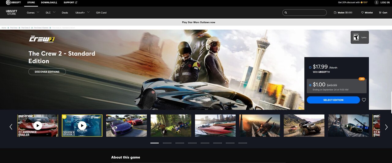20. The Crew 2 base game from 2018 is onsale until 11:00 a.m. today for $1.00 if anyone doesn't already have it or just wants to see what the fuss was about.