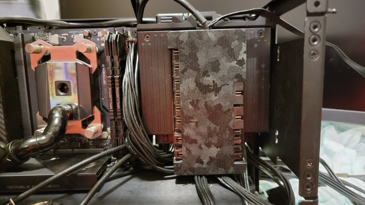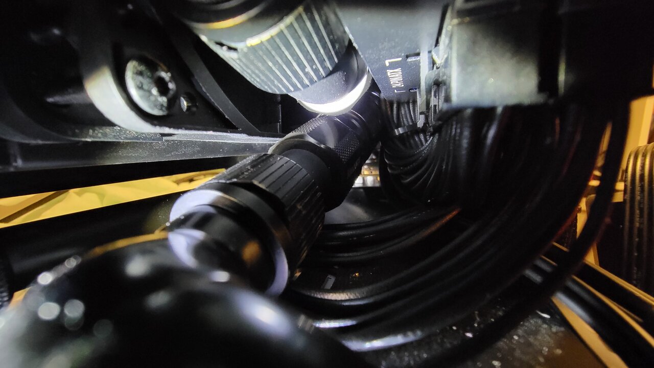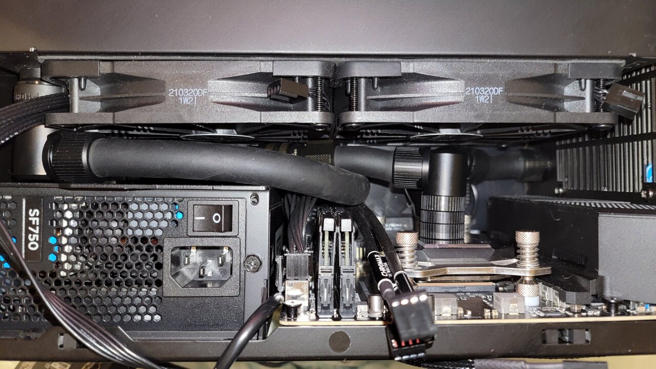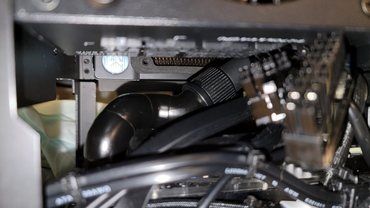 So this is how tight I love my builds.... there is literally no space left So funny thing happened, I ran out of tube. I actually might need to use one metal run. Will see after I cut for cpu if end piece will be long enough So 2 hours later... I was able to shut the side radiator meaning everything is hooked up. I set up loop that I can run in bottom rad only if need be due to way I hooked up quick disconnects. My fingers do hurt and they started going black from all paint transfer. Last leg of the journey. Just need to connect commander pro and find home for it Aaaaaaand pray I wired everything correctly and it will work I do have flow meter coming but I am not sure if it will fit instead of metal pipe, otherwise, I might get it up and running by weekend Also no more ugly looking cables behind motherboard