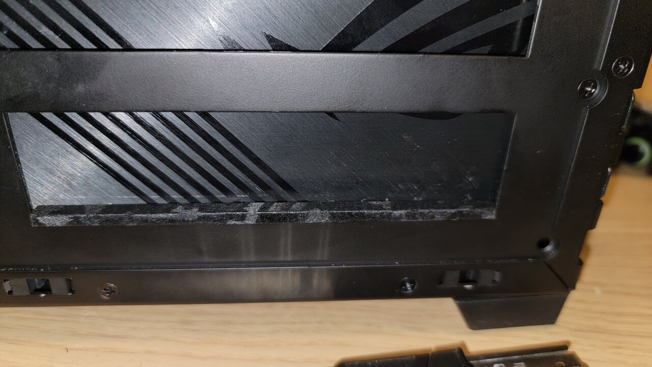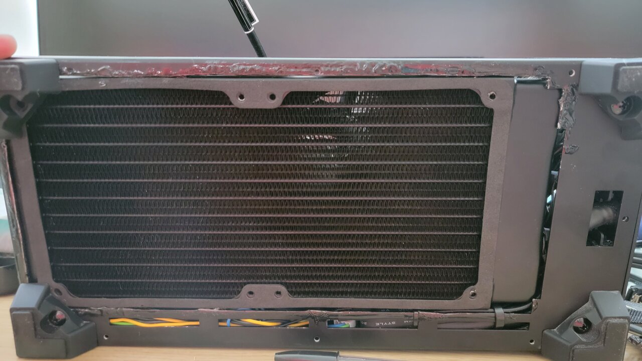 Actually, friction. I did cut hole that is smaller than radiator but big enough for main body(where you mount fans) to go past. And it rests on the feet of the case, small little let overs from case and pressed down by gpu, so it sits solid there. I only needed to sag it by like 2 mm or so since I also found a fitting that is about 1mm shorter than stock watercool blocks, I think it is ekwb.