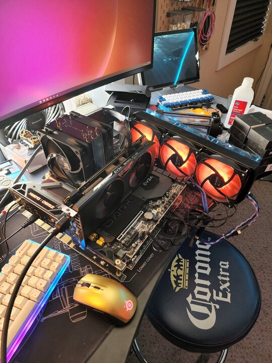 5. Lot's of things going on all at once so I apologize for the messy photos... Roommates EX was living in the downstairs living room for the past month while trying to find an apartment. So a bunch of stuff ended up piled up in the upstairs living room where my sim rig currently is buried. She just moved out today so things will all get moved around soon. Sim rig and projector are moving downstairs and I'm just going to put a big TV up in this space. New CPU and motherboard are on my workbench along with a 960 I'm going to run for the HWBOT thing. Going to make a simple water loop to do those runs since I want to get some decent scores with the 11600k for HWBOT. I can currently only fit one stick of RAM with the air cooler I had handy.