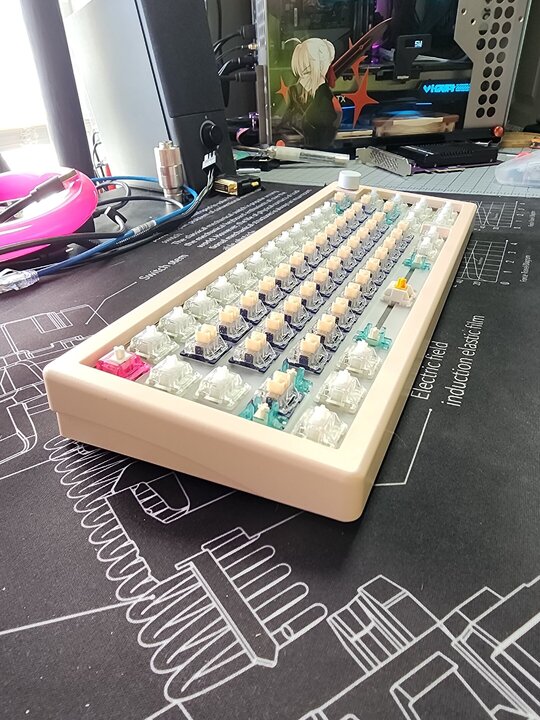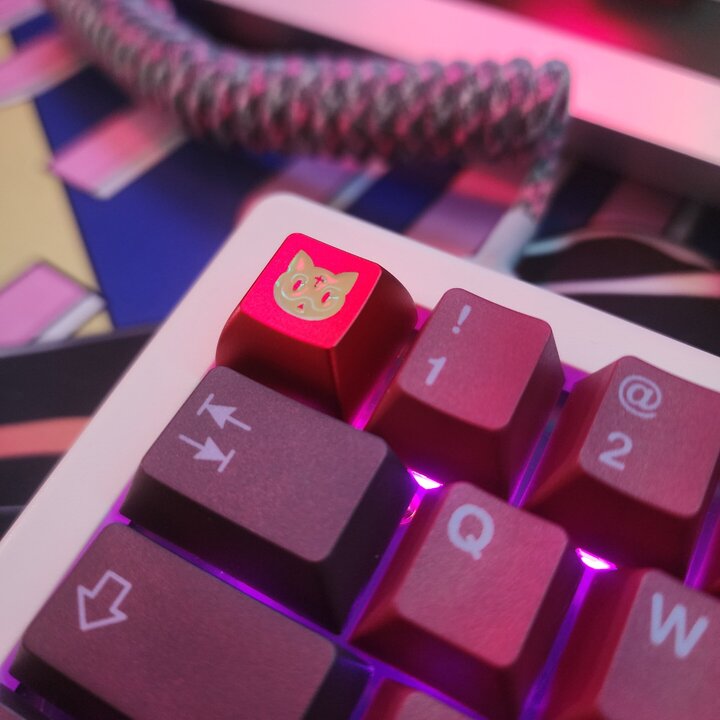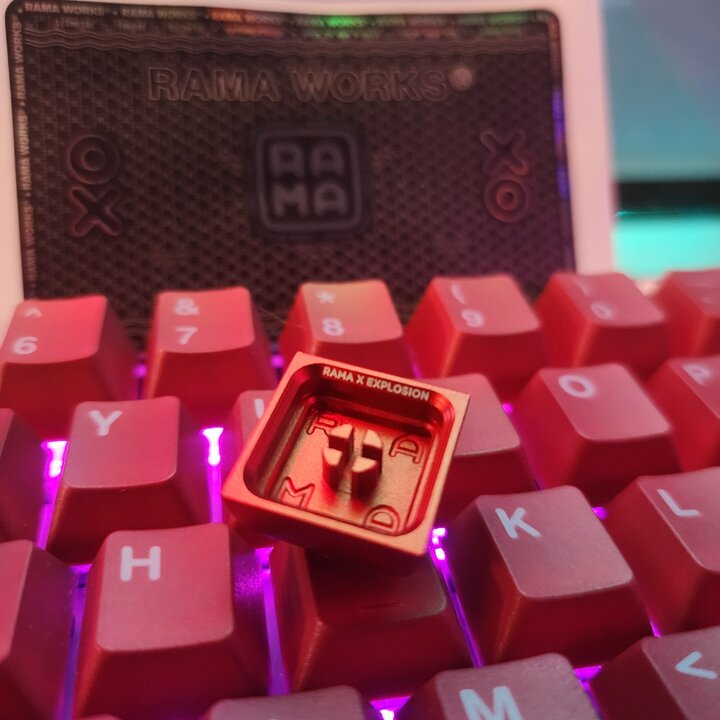 I'm continuing my trend of budget boards with nice keycaps lol RAMA KAT Explosion artisan. Was supposedly "in stock" but I ordered May 7th and it showed up today. The rest of the keycaps are Infinikey Cabernet. I'll take some nice pictures of the whole board at some point but it's just a cheap beater. Epomaker EK68 VIA Kit that I got for practically nothing open box. Wired and Bluetooth work but the 2.4g wireless adapter seems bad. I use it wired so it doesn't bother me. Tossed a mix of switches I had laying around. Redragon pandas for the Alphas and Cherry MX Clear modifiers.