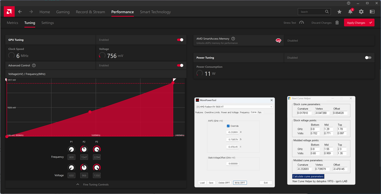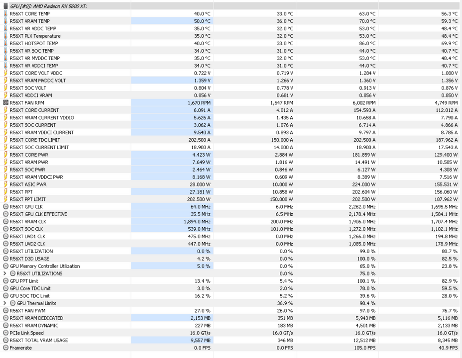 4. This is what I'm running now about 1925mhz memory @ 850mv vddci @ 1350mv mvddc @ 205w @ 79C hotspot. It's hitting over 2,200mhz at times on the core, amazing bios here. 5600XT_NAVI10_2300MHZ_1925MHZ_1350MV_2300MHZ_1350MV_OD_650MV_SOC_GFX_SENSORS_THERMAL_88C_84C_205W_205A_CALIBRATED.zip
