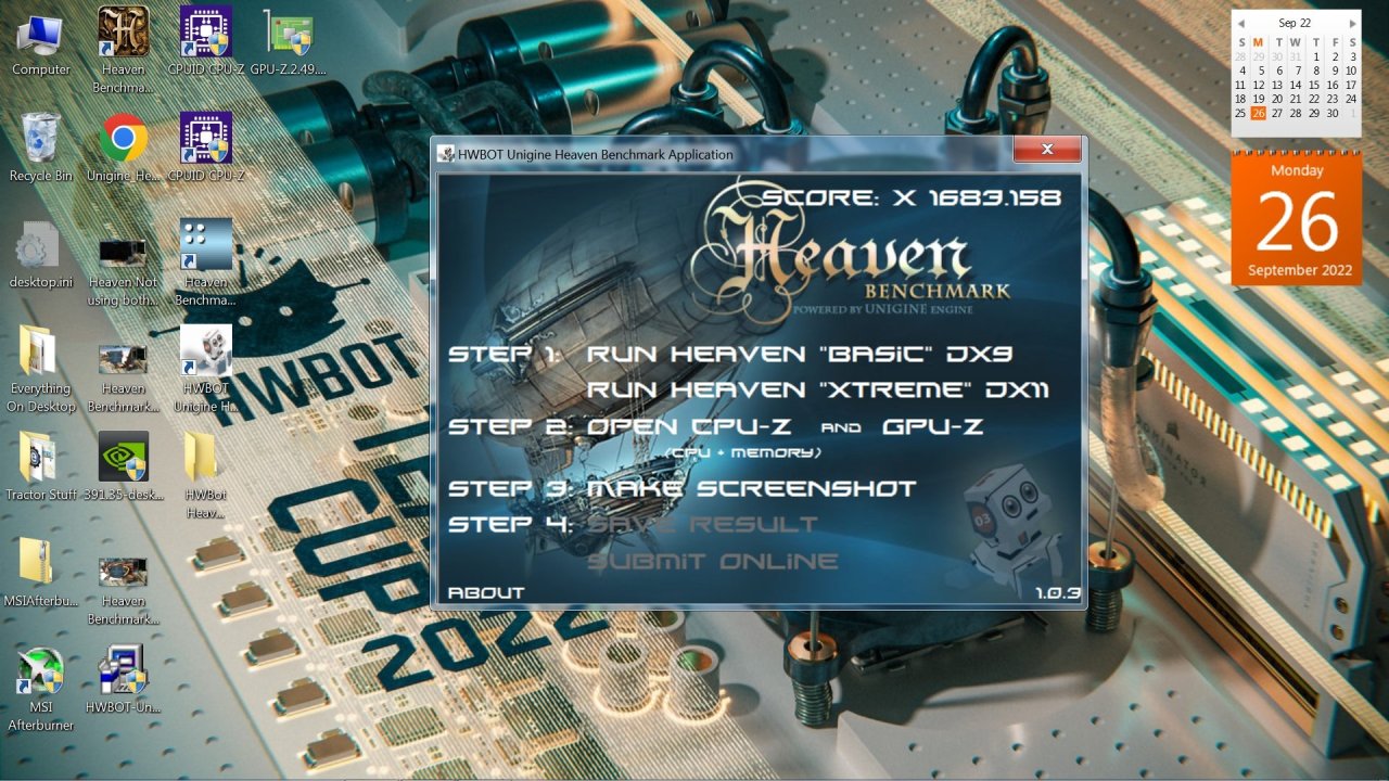 I just saved that screen shot. Need to figure out how to save the heaven score. I overclocked the GPU core by 20Mhx LOL Just baby steps to see what it can do before it freezes up. Time to put the side of my case back on and see if I can do any better Edit: Ok Let me go back and make a screen shot from clicking on that link to make it official I'm wondering how much better my score can get???