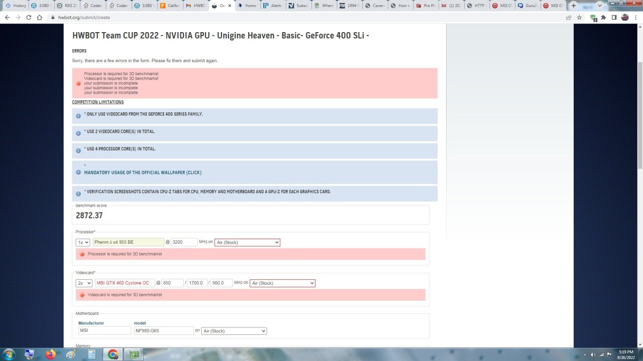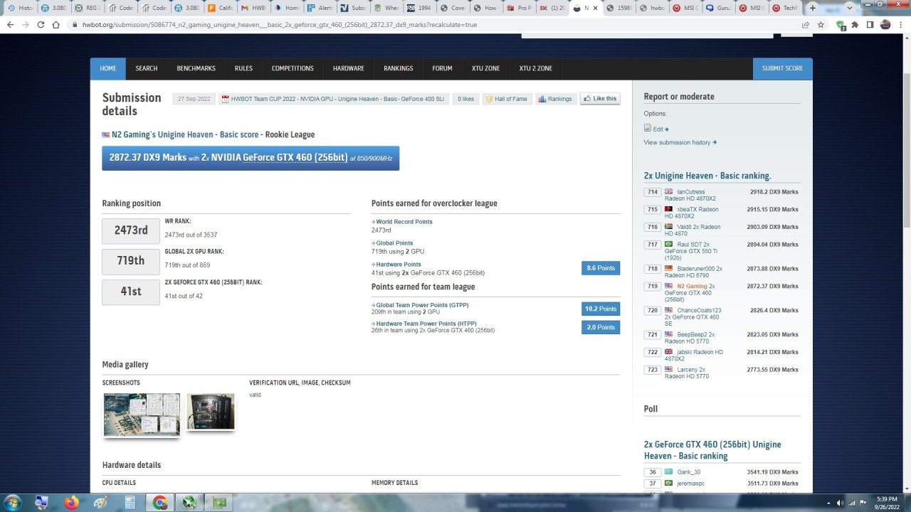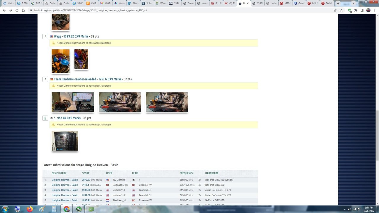 Problem solved My God, I had to jump through so many hoops just to get an entry ran and properly submitted. 1st talk with PIo about it, Then find a card after tearing my garage apart, then clean and card and break 5 blades off of one of the twin frozer fans, glue the fan blades back on and then the whole sli not working followed by HWBot Unigen Heaven Basic not working and then getting the run submitted. N2 pat's him self on the back Oh yeah and then after finding out after submitting it that it was not submitted to any team LOL....