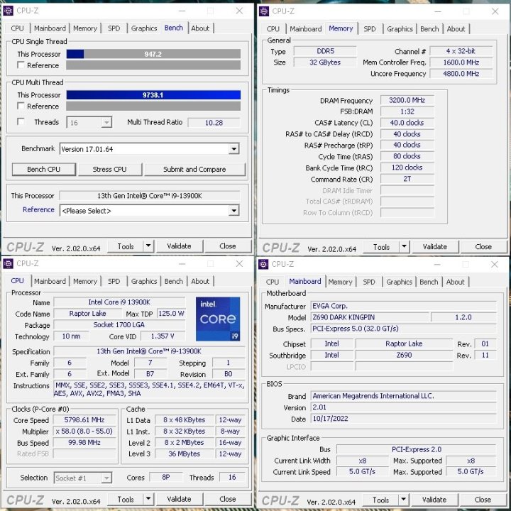 13900k @5.8ghz Pcores and 4.3ghz Gcores, 4800 cache and 6400mem. A lot of things are acting up in the bios though and Eleet is not working either, EVGA has some work to do..